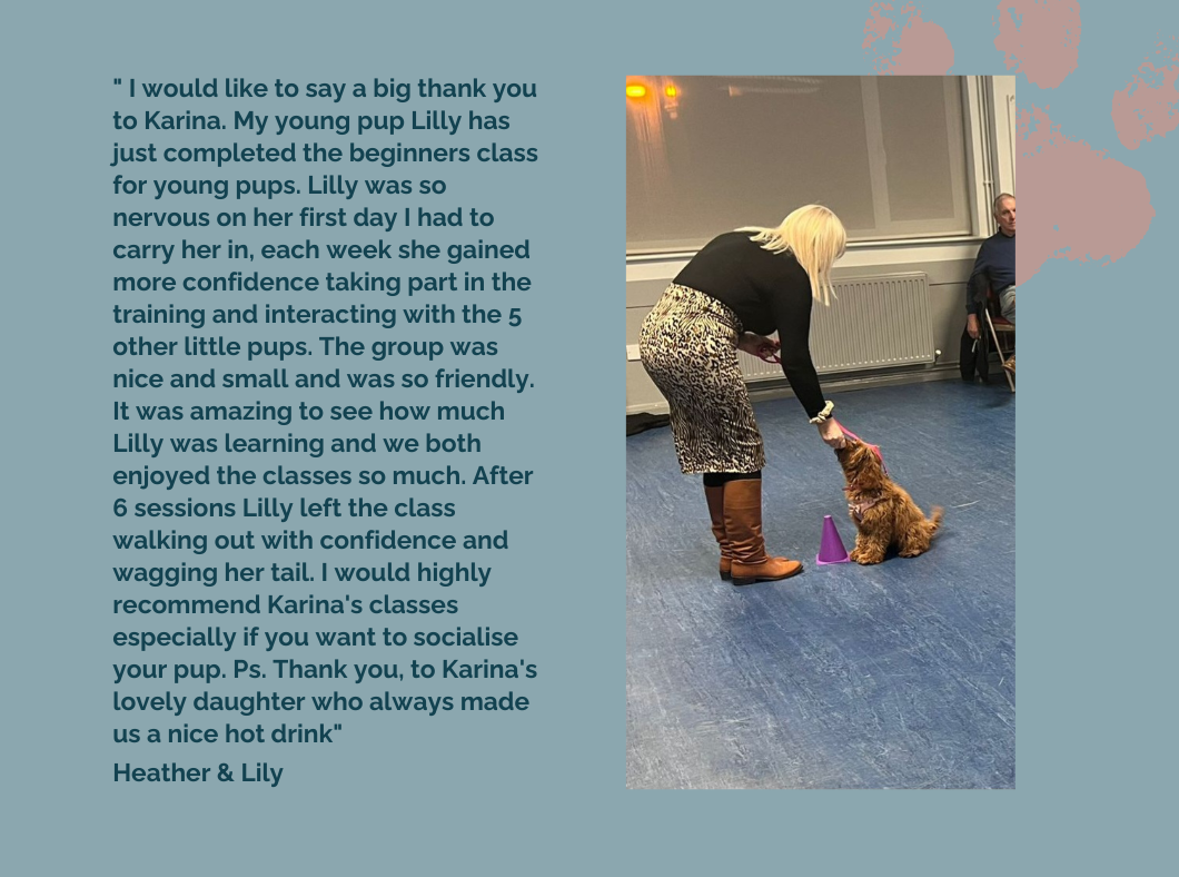 Hi, I am Karina. I’m a professional, experienced dog Behaviourist and Trainer. I have been working for an assistance dog charity for the past 7 years as a dog trainer and have over 15 years experience training and working with dogs. Over the years I have worked with a variety of dogs on a lot of different behaviours. I have also enjoyed Gundog training, flyball, agility and scent work training and I have been fostering and rehabilitating rescue dogs for about 14 years.